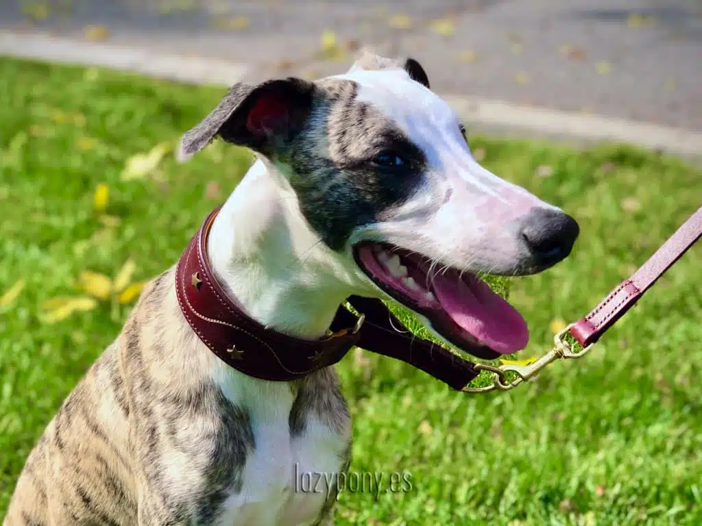 Los collares classicos no son buenos para ellos. Lo mejor es el collar especial para galgos. Estos collares están especialmente fabricados para perros con cuellos largos y gráciles como galgos y Whippet. Es más ancho en el medio para prevenir daños en el cuello si tu perro tira de la correa.