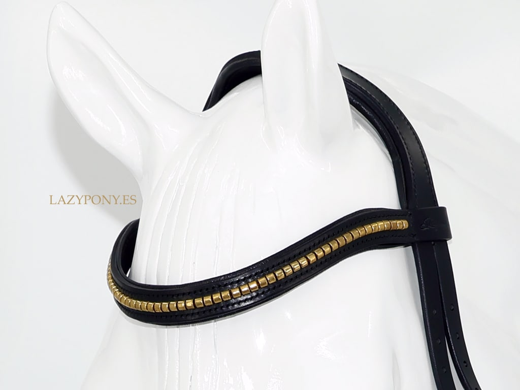 Cabezada anatómica clincher Lazypony. Esta cabezada de cuero a medida cuenta con una testera anatómica que permite el libre movimiento de las orejas. La muserola, la frontalera y la testera tienen acolchado suave para mayor comodidad del caballo. La cabezada incluye ahogadero fijado a las carrilleras para una mejor estabilidad, mayor libertad en la garganta y para evitar que un bocado de palanca empuje las carrilleras hacia los ojos. ¡Una cabezada fantástica para concursos y para la equitación diaria! La cabezada clincher de cuero hecha a mano Lazypony está fabricada con cuero natural suave y resistente. Utilizamos herrajes de alta calidad y la cosemos cuidadosamente a mano con técnicas tradicionales de guarnicionería: es increíblemente fuerte y duradera.