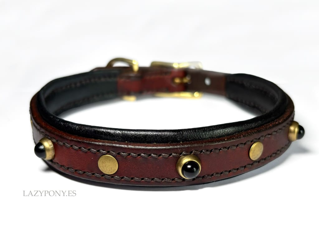 Handsome decorated leather collar Lazypony for small dogs, puppies or cats. That elegant item decorated with lovely rivets. We made it with soft pad for comfort of your pet and high-quality brass\stainless steel hardware for style and safety. This exclusive handcrafted accessory with bright design will emphasize the unique and beauty of your beloved pet!