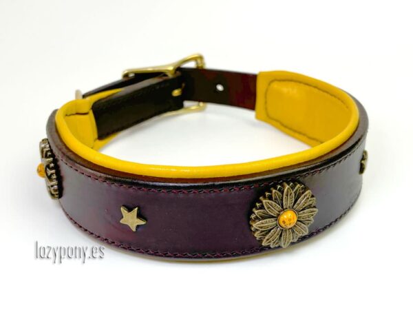 Gorgeous handcrafted leather dog collar Lazypony decorated with graceful conchos. It made of top-quality genuine leather and carefully hand stitched. This beautiful item has soft padding for comfort and style. That handsome collar will emphasize the natural beauty of your dog and stand you out from the crowd! With Lazypony handcrafted collar can be sure of your dog’s safety. We made this collar of strong natural leather and use high-quality brass\stainless steel hardware. Even the largest and strongest dog will not be able to break it.