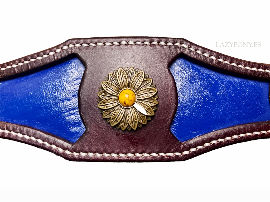 Muserola de cabezada artesanal Fancy Lazypony. Esta muserola tipo bronc está hecha de dos capas de cuero genuino con una capa decorativa intermedia y elegantes conchos. La muserola de cabezada Lazypony está cuidadosamente cosida a mano utilizando técnicas tradicionales de guarnicionería para lograr durabilidad y belleza. ¡Elige tu combinación de colores favorita! Esta exclusiva muserola tipo bronc es hermosa, resistente y duradera.