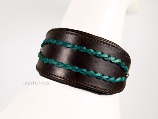 Collar de cuero para galgo Ronda Lazypony. Este collar artesanal para whippet está hecho a mano con cuero genuino sólido y suave, y equipado con herrajes de la más alta calidad. El collar de cuero Ronda está cuidadosamente cosido a mano utilizando la técnica tradicional de guarnicionerÃa, lo que lo hace muy resistente, fuerte y duradero. El collar personalizado Ronda Lazypony cuenta con un acolchado suave para la comodidad de tu querido perro y está decorado con trenzados y conchos.