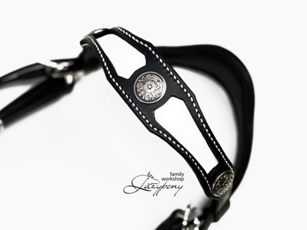 Medieval browband Lazypony padded for comfort of your beloved horse. This leather browband is decorated with cutouts and beautiful conchos. This medieval handcrafted browband Lazypony will stand you up from the crowd both at home and shows!