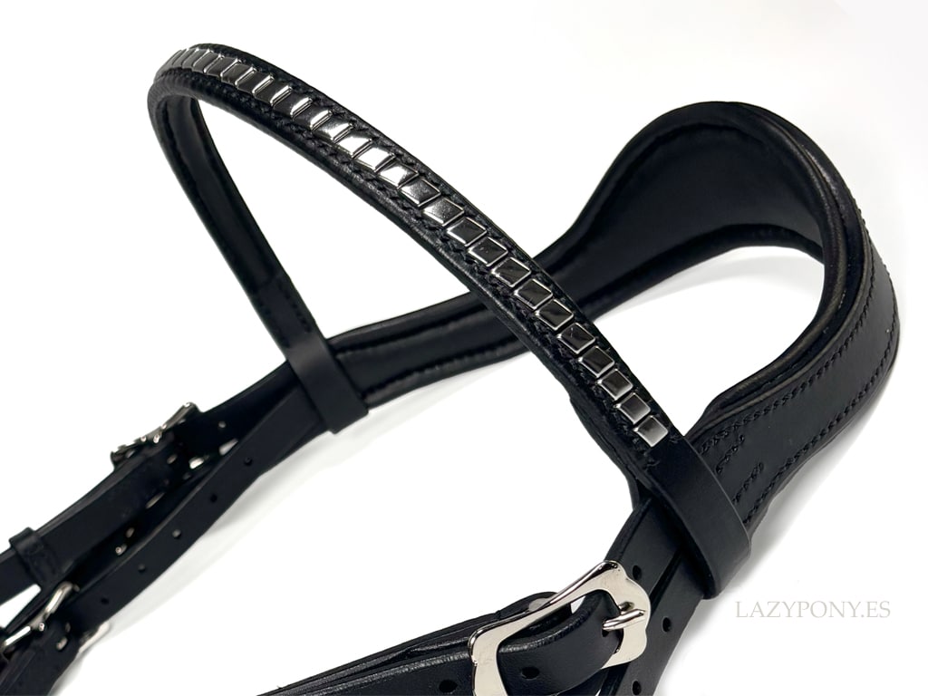 Frontalera recta con clincher Lazypony. Esta frontalera con clinchers cuenta con un acolchado suave. La frontalera artesanal Lazypony es muy cómoda para el caballo y tiene un aspecto elegante y llamativo. Puedes elegir entre clinchers de latón o plateados. Amplia gama de colores disponibles. Esta hermosa frontalera de cuero es perfecta para el uso diario, sesiones fotográficas y concursos.