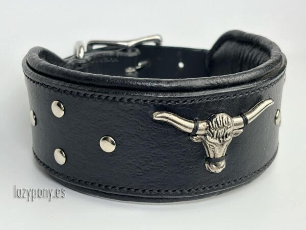 Wide leather dog collar Bull handcrafted by family workshop Lazypony. It made from durable genuine leather and decorated with elegant concho Bull and rivets. We make it with soft pad for comfort of your dog. This stylish leather dog collar hand-stitched using traditional saddlery technique and equipped with top-quality hardware. Even the largest and strongest dog will not be able to break it.