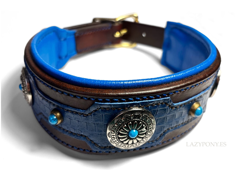 Collar de cuero ancho de lujo para perros Lazypony hecho a mano con cuero genuino duradero y decorado con cuero, elegante concho y remaches. ¡Este hermoso collar ancho para perros resaltará el poder y la belleza única de su perro! Con los collares artesanales de Lazypony podrás estar seguro de la seguridad de tu perro. Hicimos este collar de cuero natural resistente y utilizamos herrajes de latón y acero inoxidable de alta calidad. ¡Ni siquiera el perro más grande y fuerte podrá romper este collar de lujo para perros!